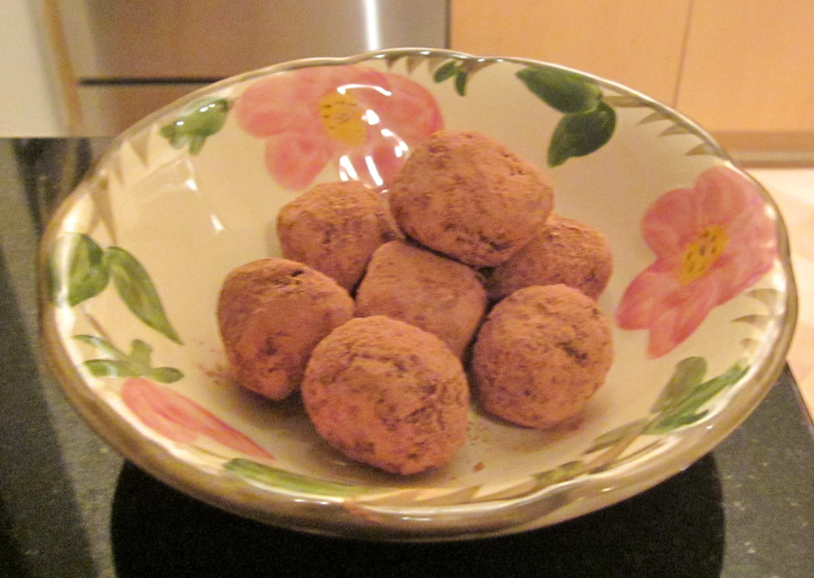 Here’s a great little chocolatey treat with no processed sugars or dairy fat added. These delectable tidbits contain antioxidants from the raw cacao, omega-3 fats from the walnuts, natural sugars and fiber from the dates. Try to use all organic ingredients for a truly decadent raw dessert. This recipe will probably yield a couple dozen truffles – more or less depending on the size.